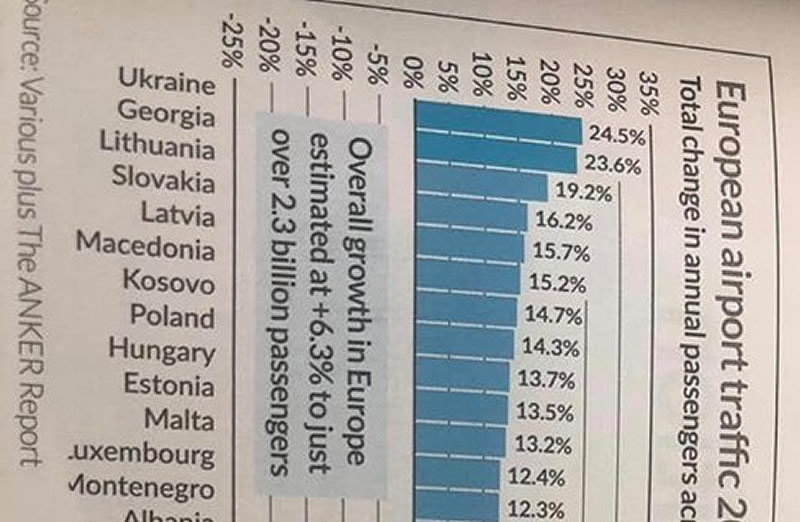 Согласно опубликованного рейтинга, темпы роста авиаперевозок в Украине в 2018 году составляют 24,5%. Второе место занимает Грузия с 23,6%. Третье - Литва с 19,2%.