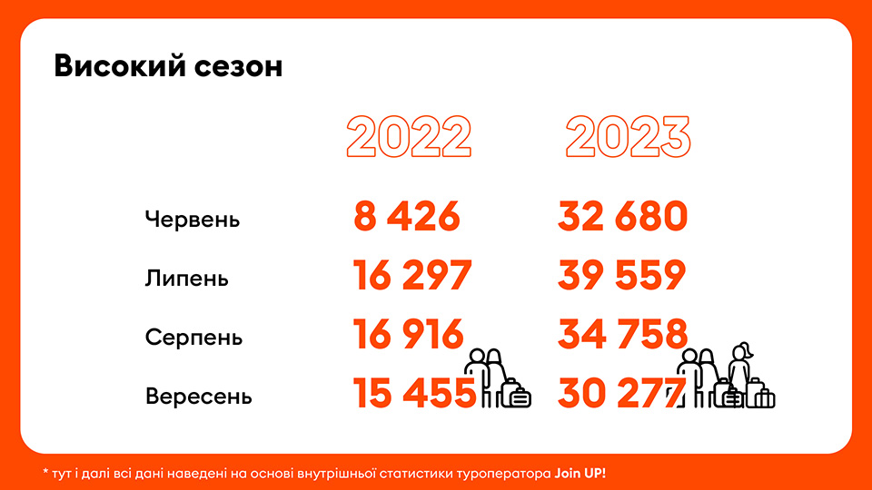Загалом найпопулярніший місяць серед туристів Join UP! — липень, коли відпочивати відправились 39 559 осіб. Найменш актуальним для поїздок виявився лютий — лише 7 026 туристів.